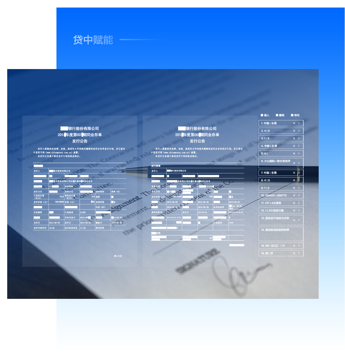 针对贷前审核材料种类多,格式多,篇幅长的痛点,实现材料格式结构化及人物、事件、组织、数值、条款等各类关键信息抽取,快速整合信息,提高审核效率